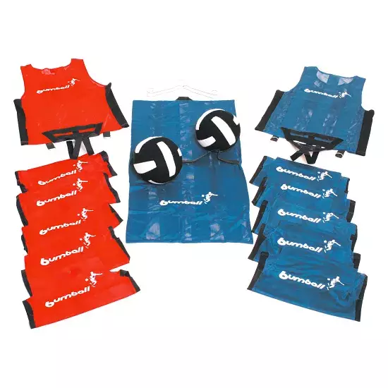 Het werpspel "Bumball" bestaat uit 12 hemdjes met klittenband - 6 elk in blauw en 6 in rood, twee klittenbandballen en een praktische dagtas.