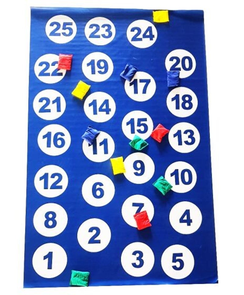 Deze grote mikmat kan op de grond uitgelegd worden, om er met pittenzakken allerlei mikspellen op te kunnen spelen. Op het kleed zijn targets met de getallen 1 t/m 25. Zo kunnen er reken opdrachten verzonnen worden, aan de hand waarvan op de juiste cijfers gemikt moet worden. Een leuke en leerzame toevoeging aan de gymles!
